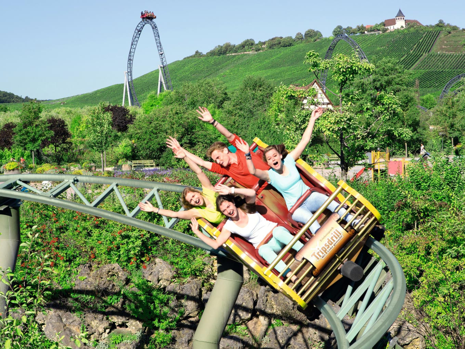 The amusement park for the whole family and Germany's first adventure park is located in the midst of blossoming nature between Stuttgart and Heilbronn. Tripsdrill is located in the middle of the Stromberg-Heuchelberg Nature Park, nestled in blooming nature. The family business started in 1929 with an old wives' mill. Today, over 100 original attractions around this historic landmark delight all generations - including the Tripsdrill wildlife paradise. By the way: Tripsdrill has already won several awards as the best amusement park in Europe. The new features New 2025: The "Wild Slide" has a new waiting area that leads through an old freight yard. Before boarding, visitors will experience an entertaining show with the Swabian humor typical of Tripsdrill. New 2024: Directly next to the "Hals-über-Kopf" and "Volldampf" roller coasters, the "Wilde Gautsche", a gigantic swing in the style of a 19th century loading crane, really gets you going - up to a height of 12 meters! The two roller coasters "Volldampf" and "Hals-über-Kopf" are a world first. They are part of a unique double ride where the tracks of both rides cross several times. Volldampf" is a family roller coaster that runs both forwards and backwards. The suspended roller coaster "Hals-über-Kopf" guarantees incomparable fun. The trains do not run on top of the track, but float underneath it - at a speed of around 80 km/h and with no fewer than four somersaults. Over 100 original attractions for young and old The offer at Tripsdrill is varied - for all generations. The Katapult rollercoaster "Karacho" , which accelerates from 0 to 100 km/h in just 1.6 seconds, is clearly visible from afar. The wash tub rafting provides refreshment, while the altitude flight offers a sightseeing flight at a height of around 20 meters. The "Sawmill" play world will delight young and old on 1400 square meters. Whatever the weather, the indoor play area "Gaudi-Viertel" with numerous play options is a great place to be. The youngest children will also love the special children's attractions : duck water ride, laundry basket ride, mill stream ride or soapbox race. The day pass also includes admission to Wildparadies, which is just a 10-minute walk away. In the natural wildlife park , over 60 animal species await nature and animal lovers. Unusual overnight stays are available at the Tripsdrill Nature Resort. Here you can end the day in rustic shepherd's wagons or tree houses - ideal for a short break.