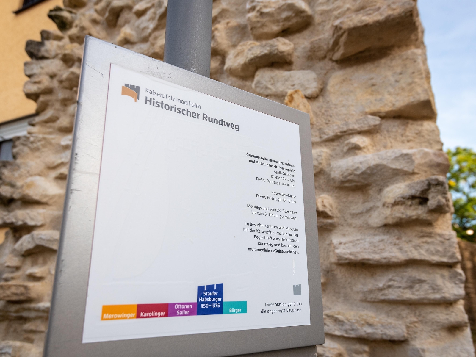 A signposting system with an accompanying booklet enables visitors to tour the Imperial Palace of Ingelheim on their own and leads to all points of historical interest where the history of the Imperial Palace can be traced. The stations are colour-coded according to the five building phases of the palace's history. For each construction phase there is a focus station with detailed information on site. The accompanying booklet is available in printed form as a brochure in the museum at the Kaiserpfalz.