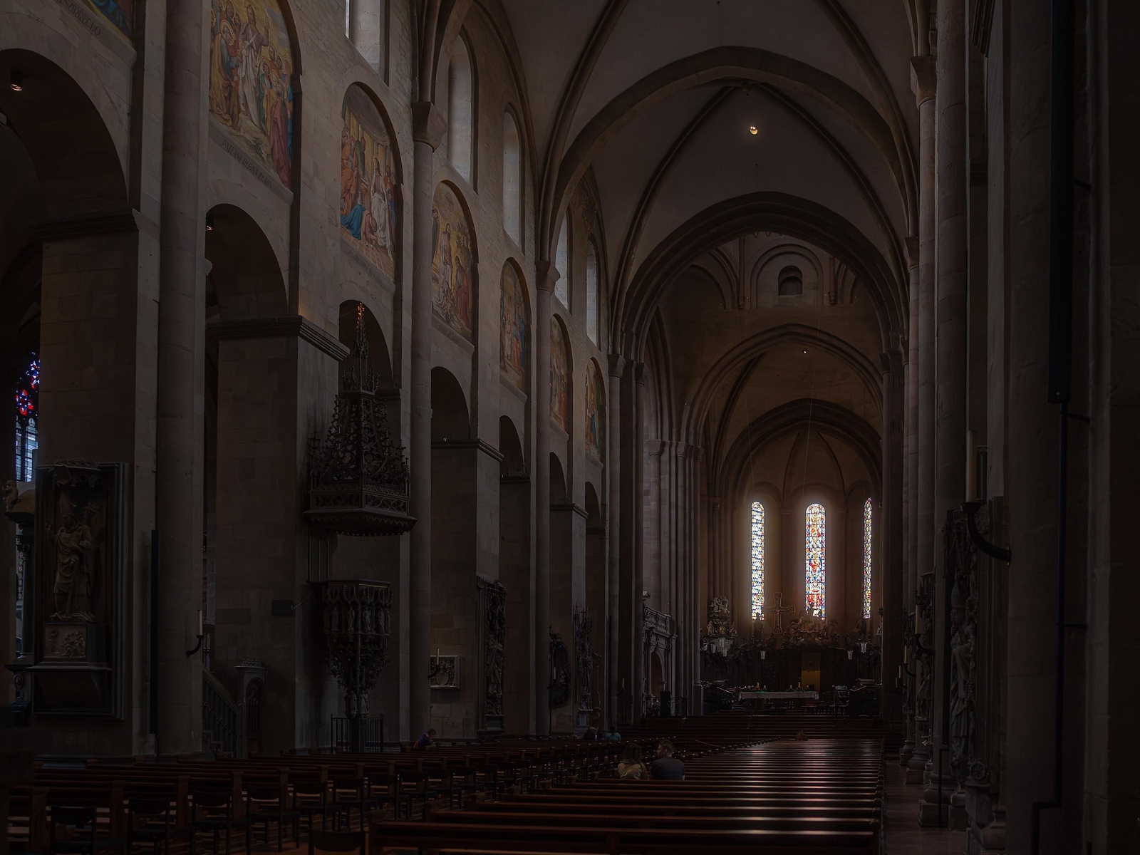 Der Ostchor mit seinen über zwei Meter starken Mauern ist der älteste Teil des Doms. Sein Vierungsturm wurde 1793 bei der Beschießung von Mainz beschädigt und im 19. Jahrhundert wiederaufgebaut. Unter dem Ostchor entdeckte man später eine Krypta aus dem 11. Jahrhundert. Der spätromanische Westchor entstand zwischen 1200 und 1239 und erhielt im 15. Jahrhundert eine gotische Glockenstube. Das Rokoko-Chorgestühl von 1767 konnte Bischof Joseph Ludwig Colmar vor der Zerstörung bewahren; ihm ist es auch zu verdanken, dass der Dom nach der Säkularisation 1803 nicht abgebrochen wurde.