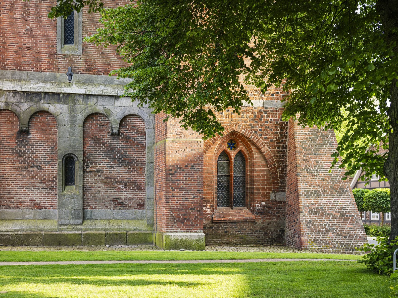 Die beiden Türme wurden bereits um 1300 aus Backsteinen errichtet, jedoch sind sie für eine Kirche dieser Größe ungewöhnlich niedrig. Der Bau des Chors begann 1389 und erstreckt sich über eine Länge von 28 Metern und eine Breite von 12,80 Metern. Der Dachstuhl stammt aus den Jahren 1405 bzw. 1428. Das Chorgestühl wurde 1487 hinzugefügt. Die Vorhalle vor dem Südportal, die einst existierte, wurde mittlerweile abgerissen, jedoch blieb die Holzplastik eines sitzenden Löwen über dem Südportal erhalten, verziert mit einem vergoldeten Bleimantel und der Inschrift "Vestigium Leonis".
